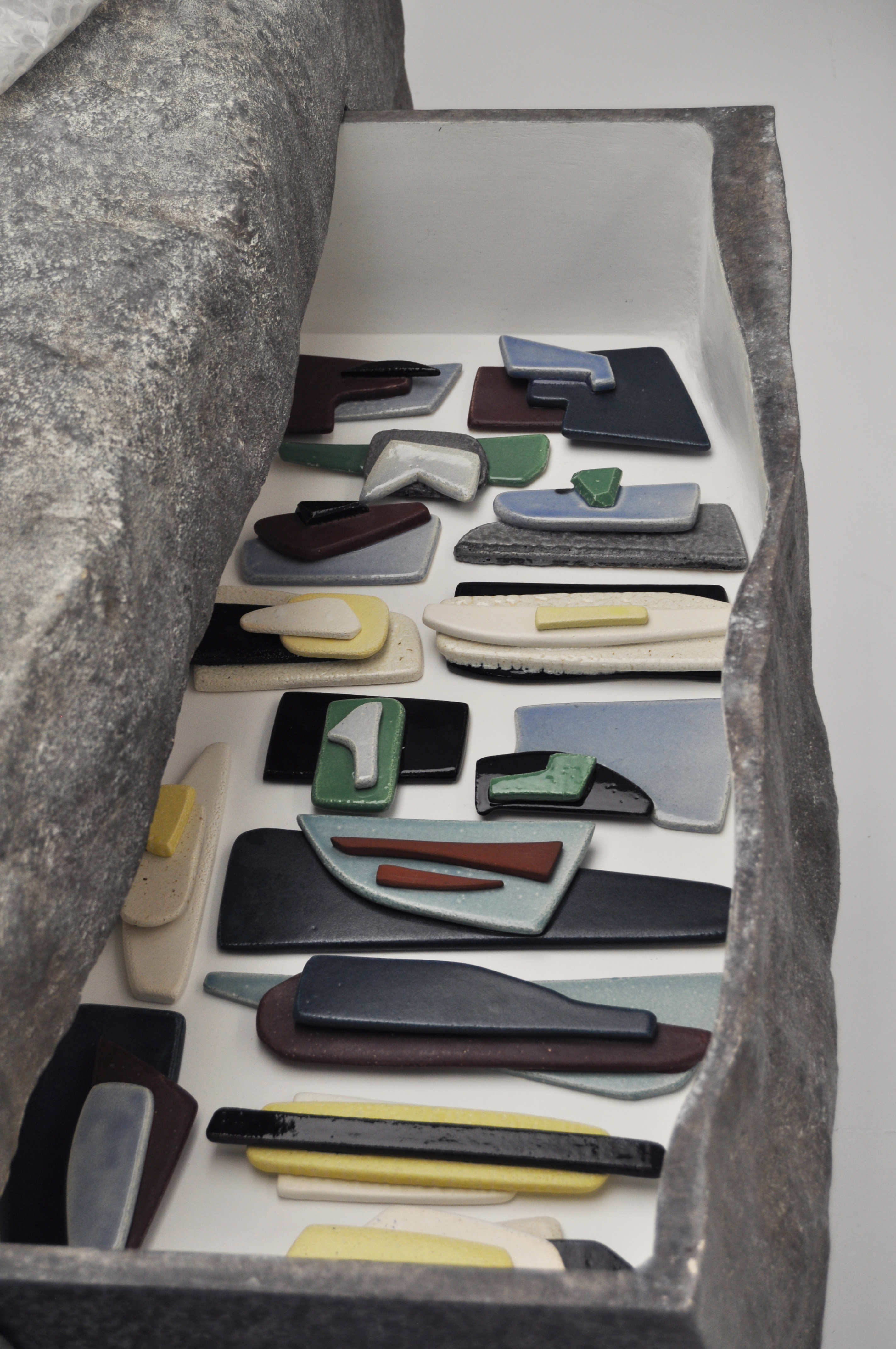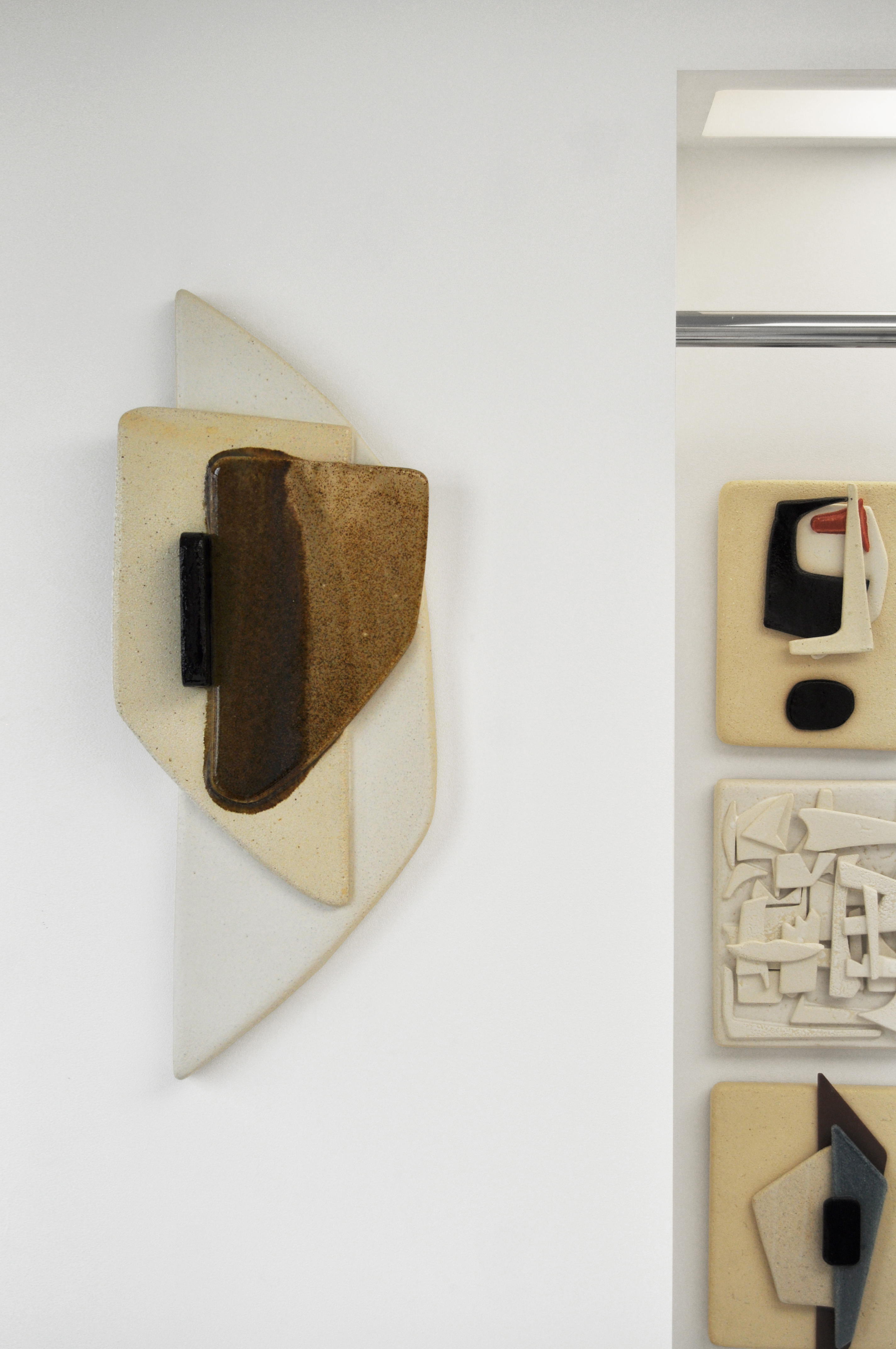 Presented in September 2023 at Galerie Untitled 19 in Paris, Leftover comprises around thirty ceramic panels. These abstract works, akin to collage art, combine various pieces of terracotta, glazed or raw, in a play of superpositions and balances. Playing with colors and materials, they resemble sculptures and result from different assemblages, revealing shapes that are both controlled and spontaneous.