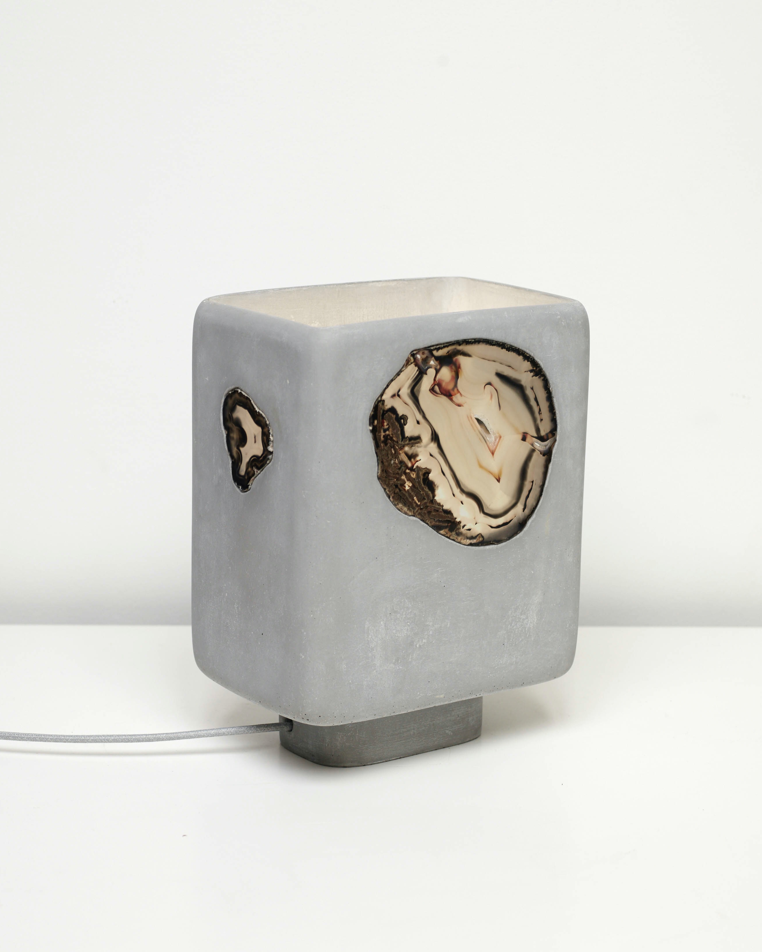 Inspirées par la passion des pierres de Roger Caillois, chaque lampe "Jewel" est unique, à l’image des agates et des quartz incrustés dans le béton et révélés par la lumière.